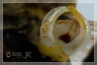 - Der Drohn stirbt nach dem einmaligen Ausfahren seines Geschlechtsteils, auch ohne Begattungsakt, sein "Stachel" bricht ab und der arme Kerl segelt zu Boden. Deshalb muss der nächste "zum Zuge" kommende Drohn zuerst den "Stachel" seines Vorgängers entfernen und hat scheinbar dafür zwei wie eine Zange ausgebildete seitliche gekrümmte Hörner.