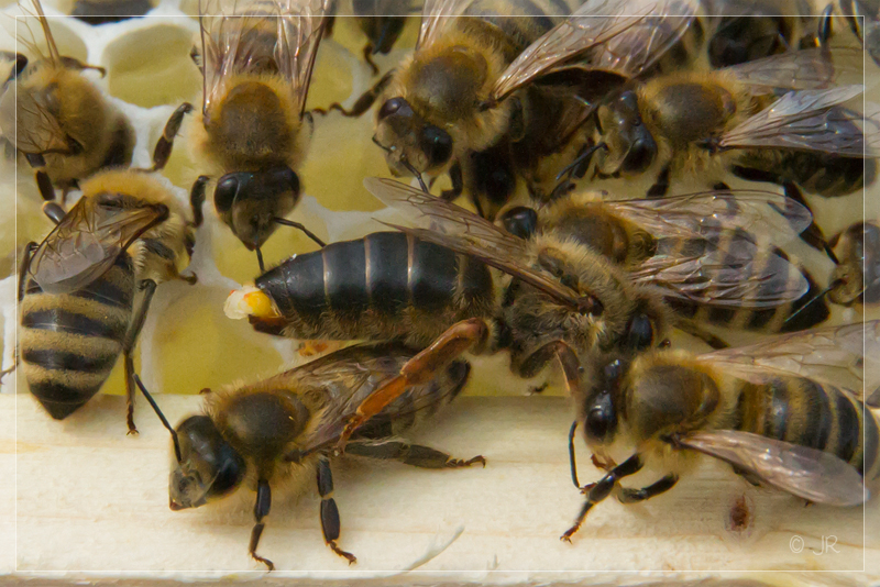Hier kehrt gerade eine frisch begattete Prinzessin, nun Königin, in ihr Begattungsvölkchen zurück. Sie ist nun eine Königin, das Begattungszeichen, d.h. das Geschlechtsteil des letzten Drohn steckt noch in der Königin und wird von den Arbeiterinnen entfernt. Nach 3-6 Tagen legt sie ihre ersten Eier und kann vorsichtig einem großen weisellosen! Volk zugesetzt werden.